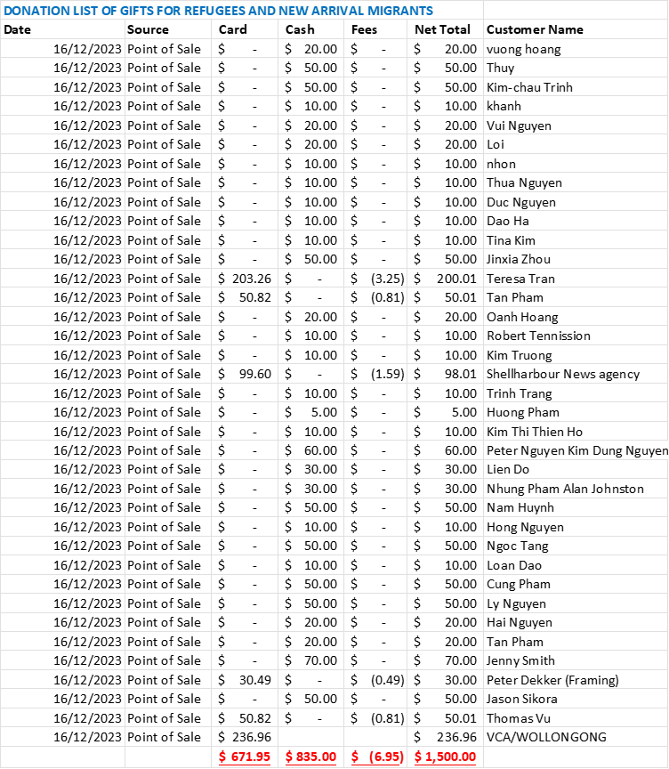 Trong buổi tiệc liên hoan cuối năm 2023 vừa qua, CĐNVTD/Wollongong đã kêu gọi lòng hảo tâm các thành viên trong Cộng Đồng, quyên góp tương trợ cho các gia đình tỵ nạn và di dân mới nhập cư trong vùng để chia sẻ trong thời gian đầu họ đến đây.