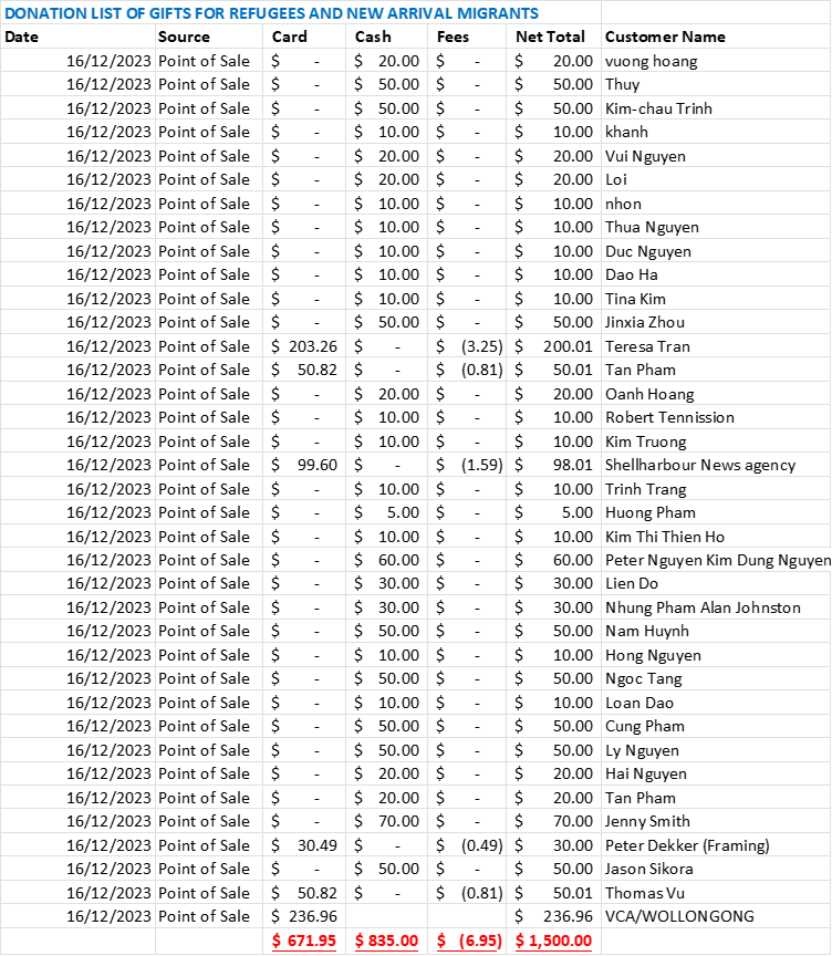 Trong buổi tiệc liên hoan cuối năm 2023 vừa qua, CĐNVTD/Wollongong đã kêu gọi lòng hảo tâm các thành viên trong Cộng Đồng, quyên góp tương trợ cho các gia đình tỵ nạn và di dân mới nhập cư trong vùng để chia sẻ trong thời gian đầu họ đến đây.